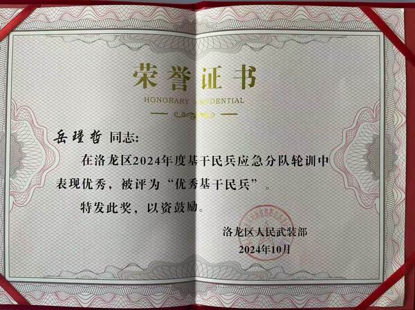 在洛龍區(qū)2024年基干民兵輪訓(xùn)備勤總結(jié)大會上,集團支部黨員岳瑾哲、張亞丹在眾多基干民兵脫穎而出,被洛龍區(qū)人民武裝部授予“優(yōu)秀基干民兵”稱號。